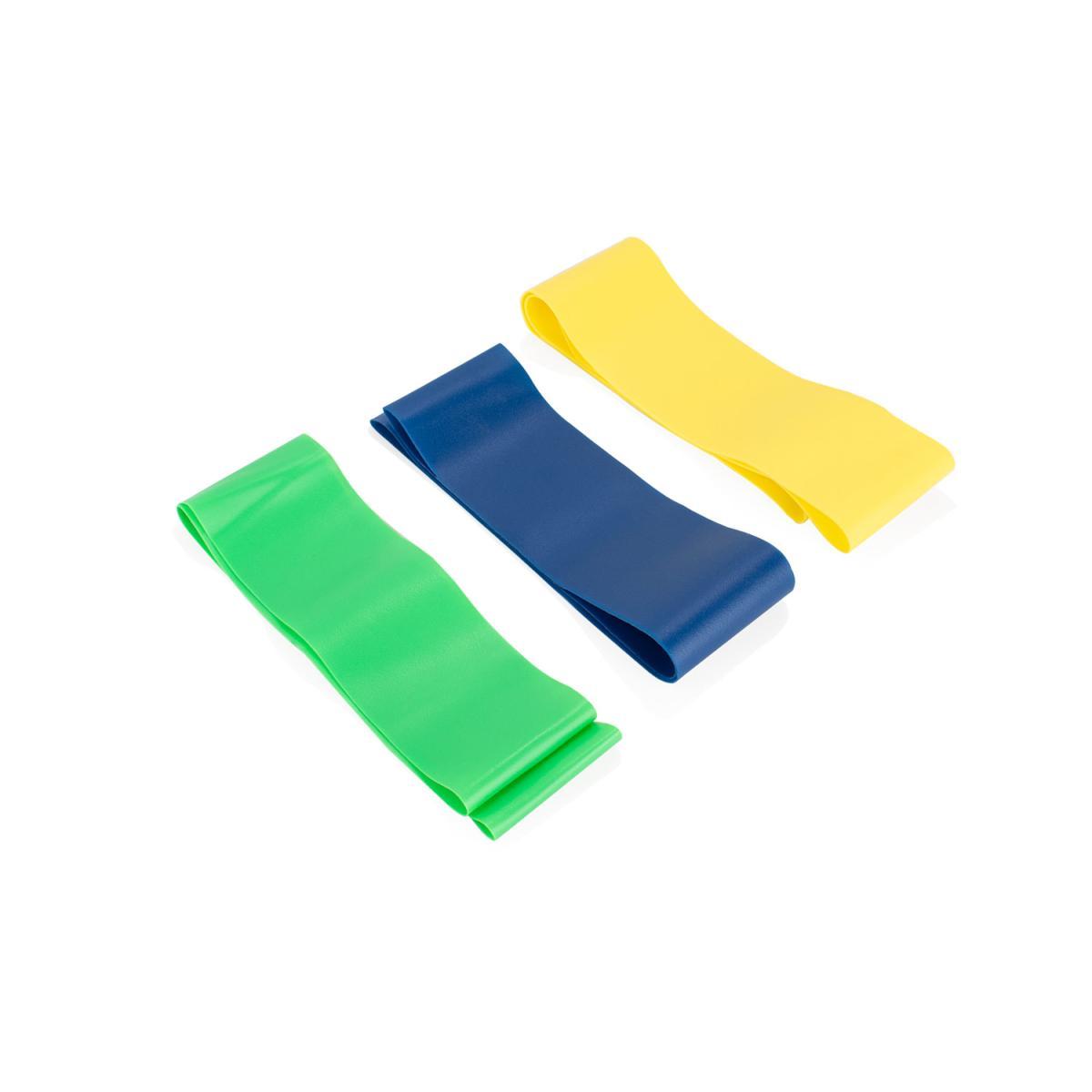 Set de tres bandas de resistencia elaboradas en TPE, un material flexible y duradero. Ideales para entrenamientos de fuerza, estiramiento o rehabilitación. Incluyen una tula práctica para transportarlas y mantenerlas organizadas.