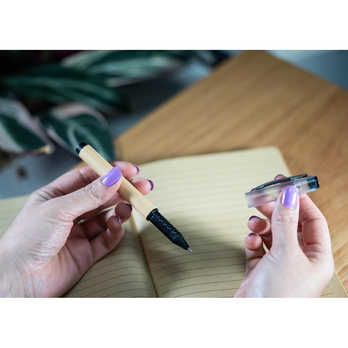 Bolígrafo Chevy con cuerpo sólido de bambú y tapa transparente con clip metálico. Cuenta con tinta de gel para una escritura suave y detalles circulares al retirar la tapa. Ideal para uso diario y regalos ecológicos.