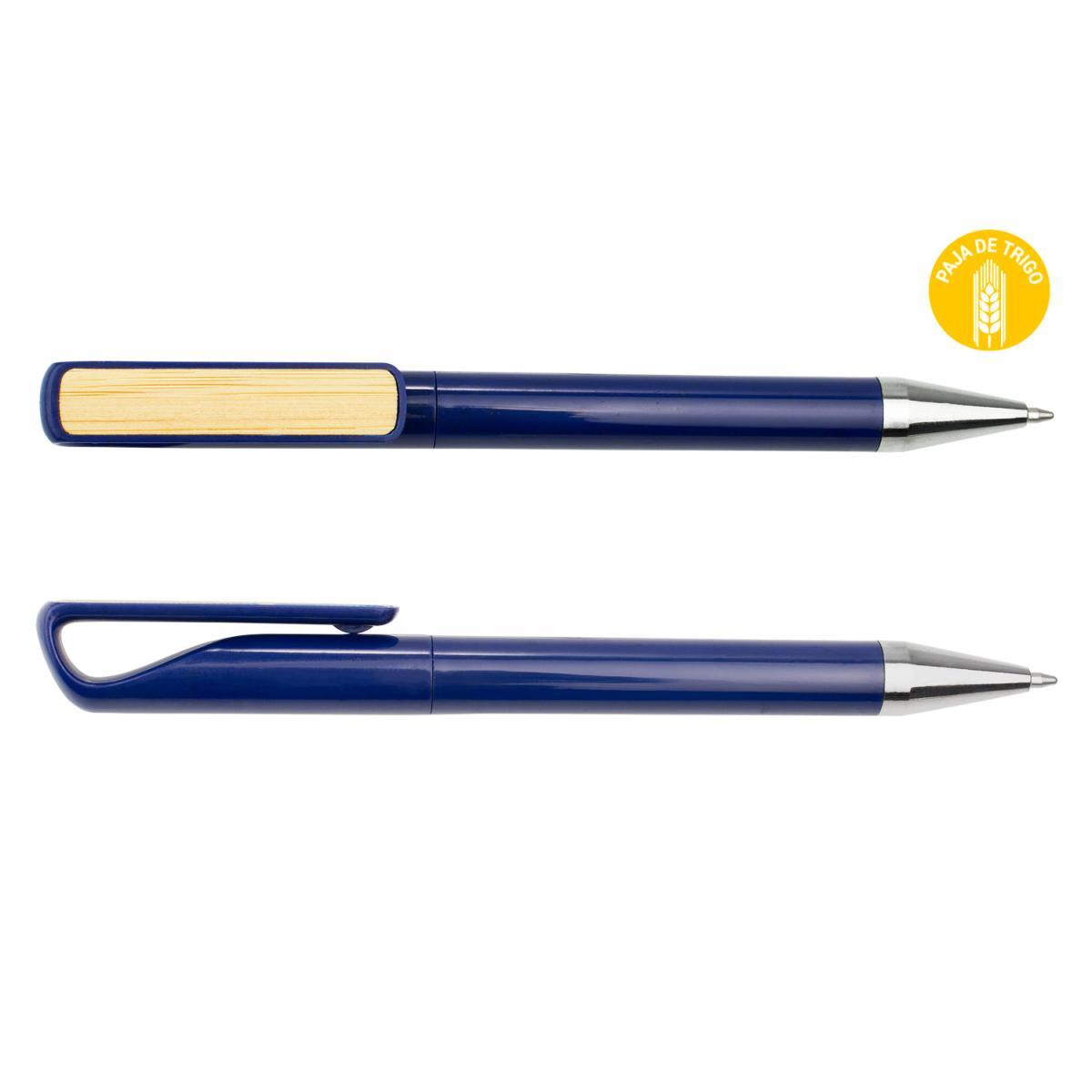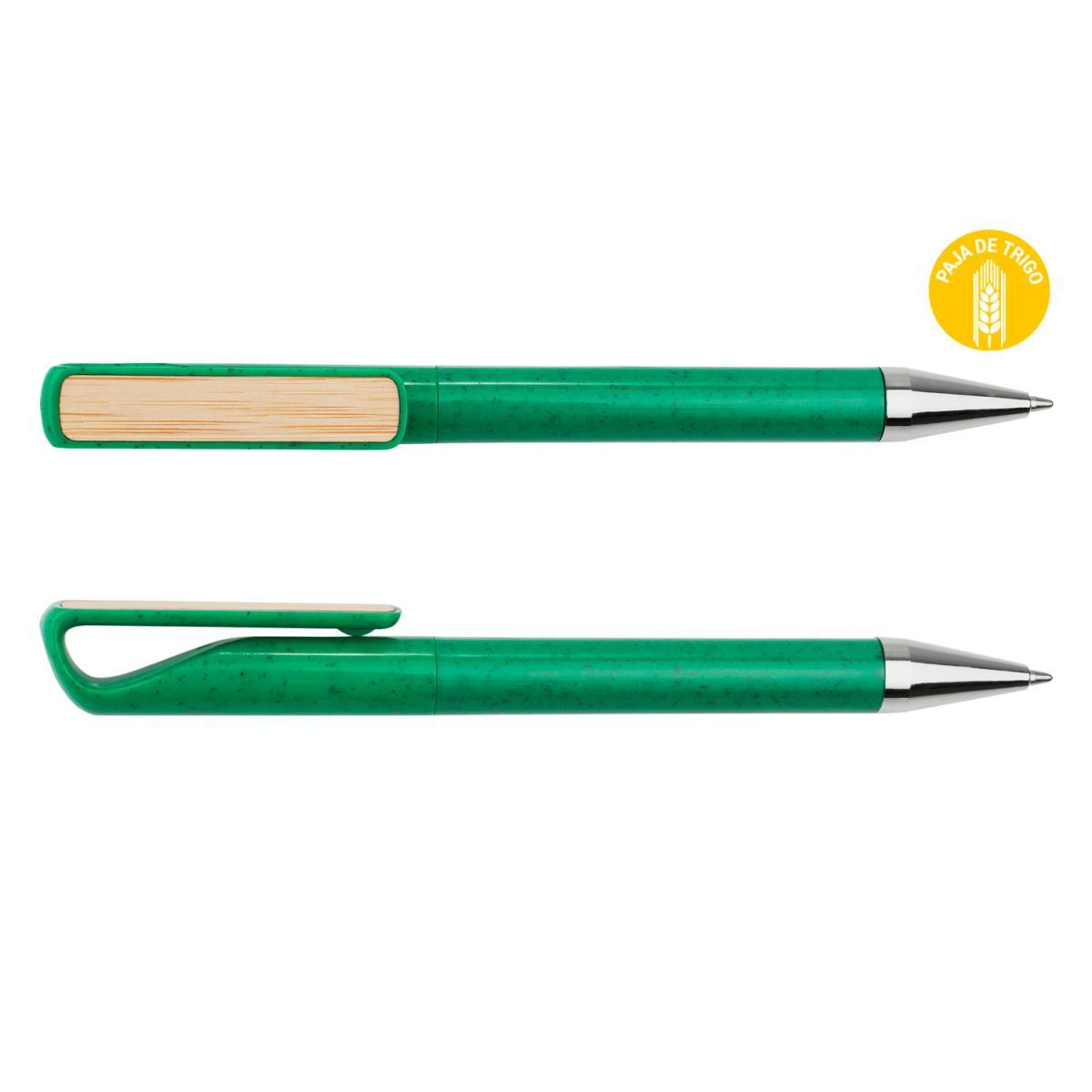 Bolígrafo hecho con paja de trigo coloreada, clip de bambú y detalles cromados. Sistema de apertura de giro. (Bolígrafo/Esfero)