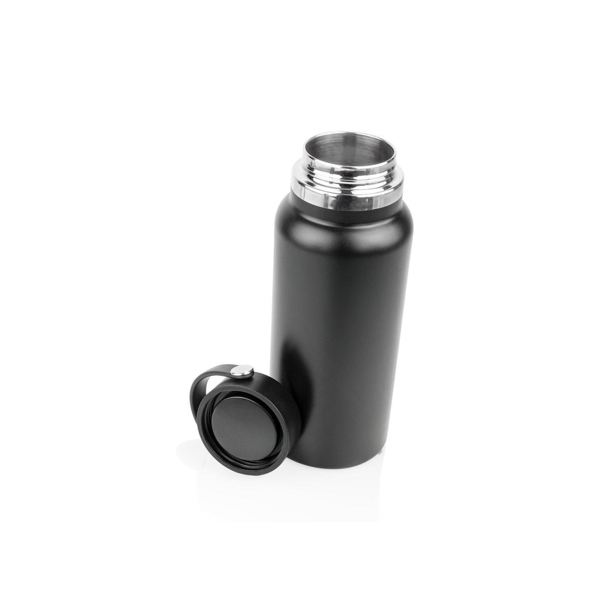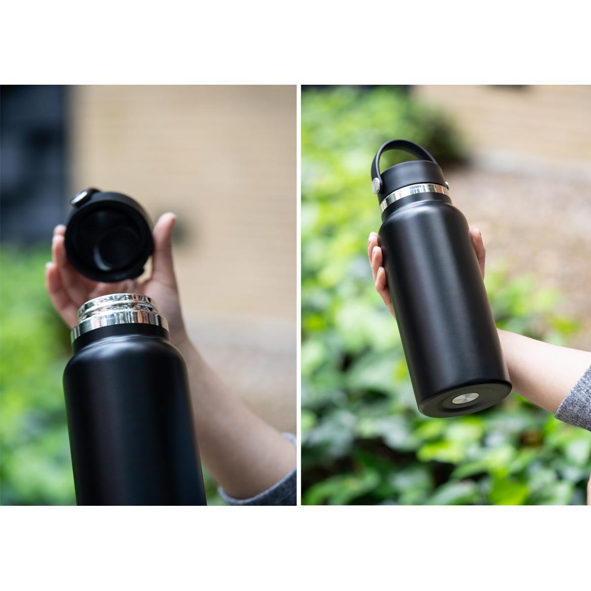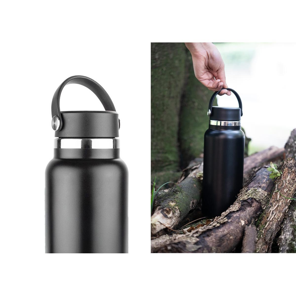 Botella de agua de acero inoxidable de 32 oz (945 ml) con doble pared para mantener la temperatura. Cuenta con tapa de rosca y asa plástica que facilitan su transporte diario. Ideal para mantenerse hidratado en cualquier lugar.