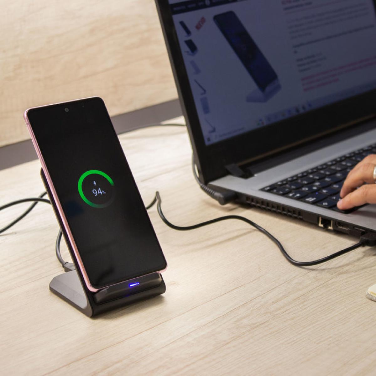 Cargador USB de carga rápida inalámbrica para teléfono móvil. Compatible con tecnología Qi para carga inalámbrica. Permite cargar en posición horizontal o vertical gracias a la doble batería de 10W cada una. Incluye cable USB de 60cm. Presentación en caja de regalo.