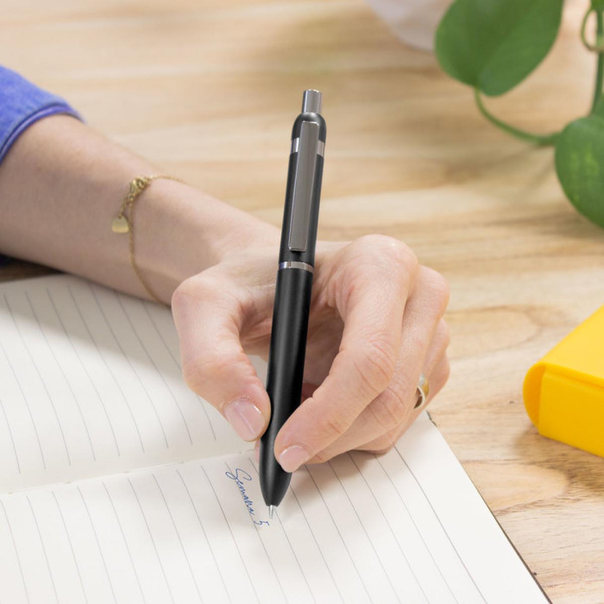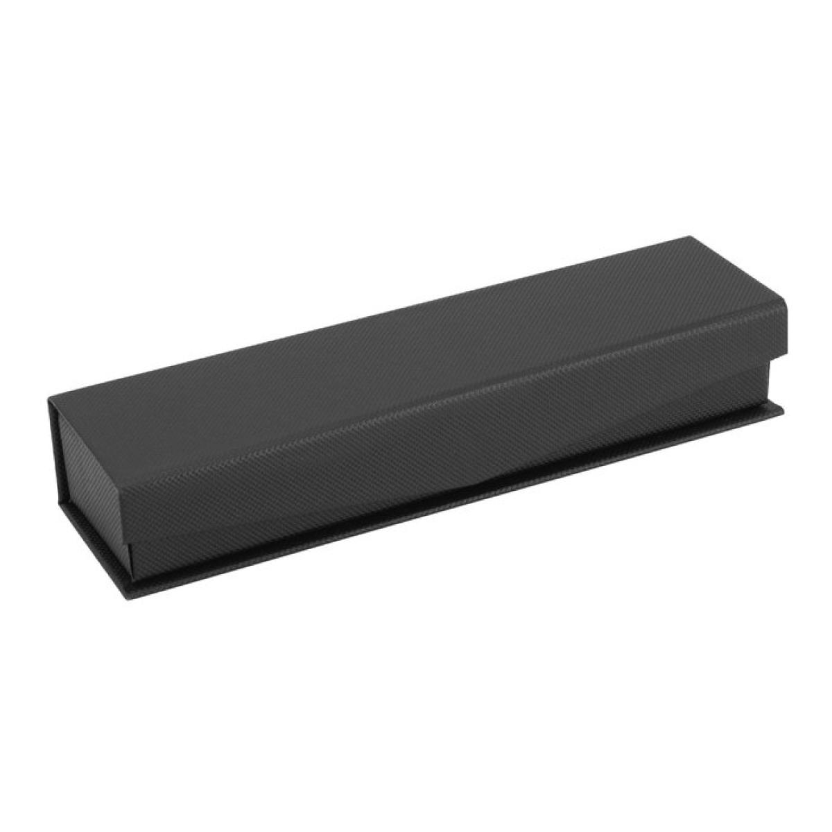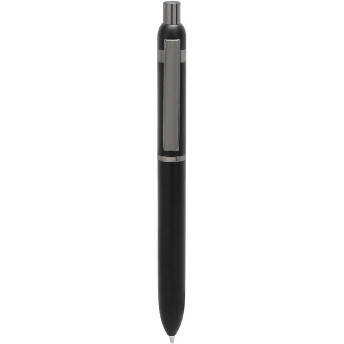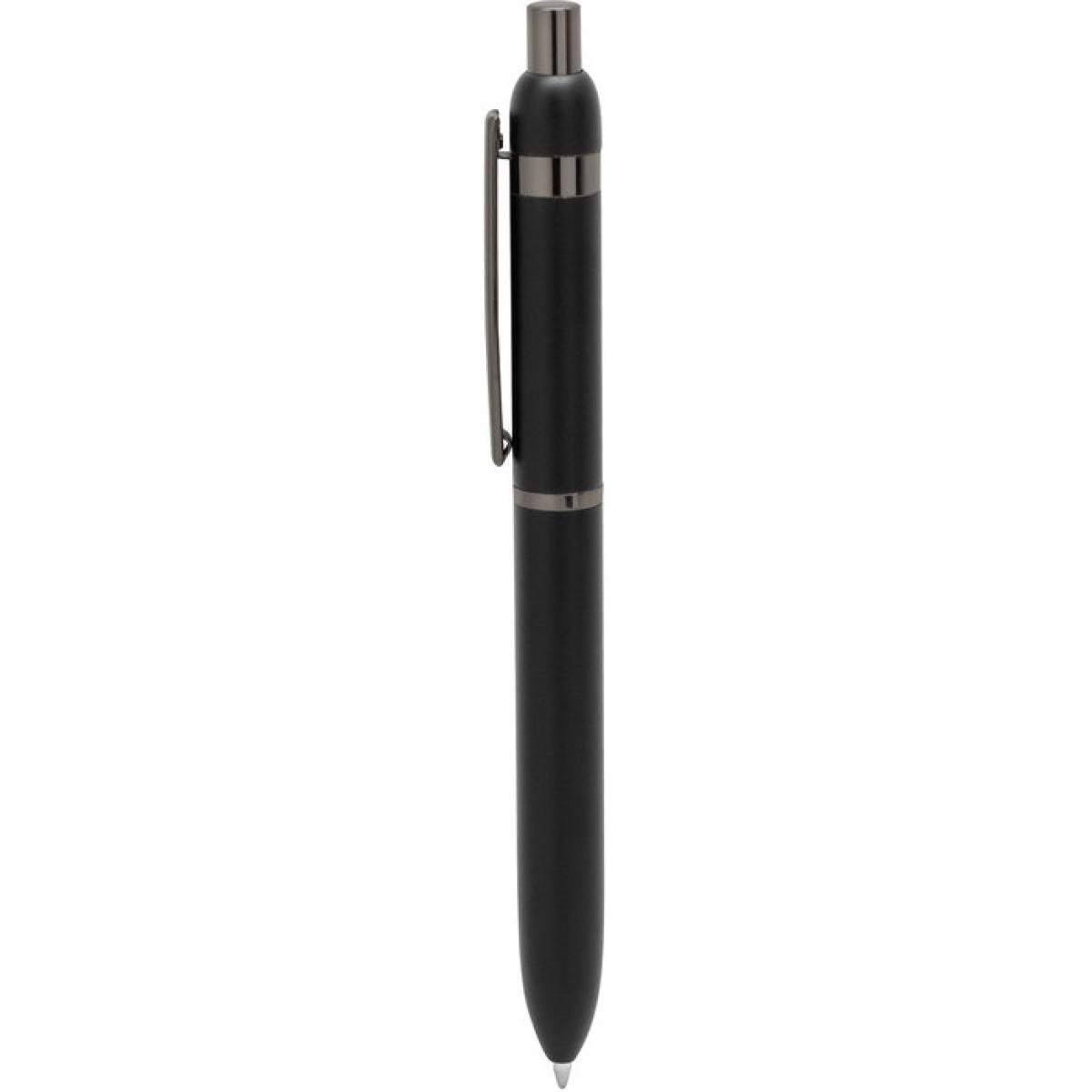 Cuerpo de aluminio. Bolígrafo retráctil. Clip, botón y anillos metálicos color plata. Tinta Negra. Destape color plata tanto en el cuerpo como en la tapa. Presentación en estuche con cierre magnético.