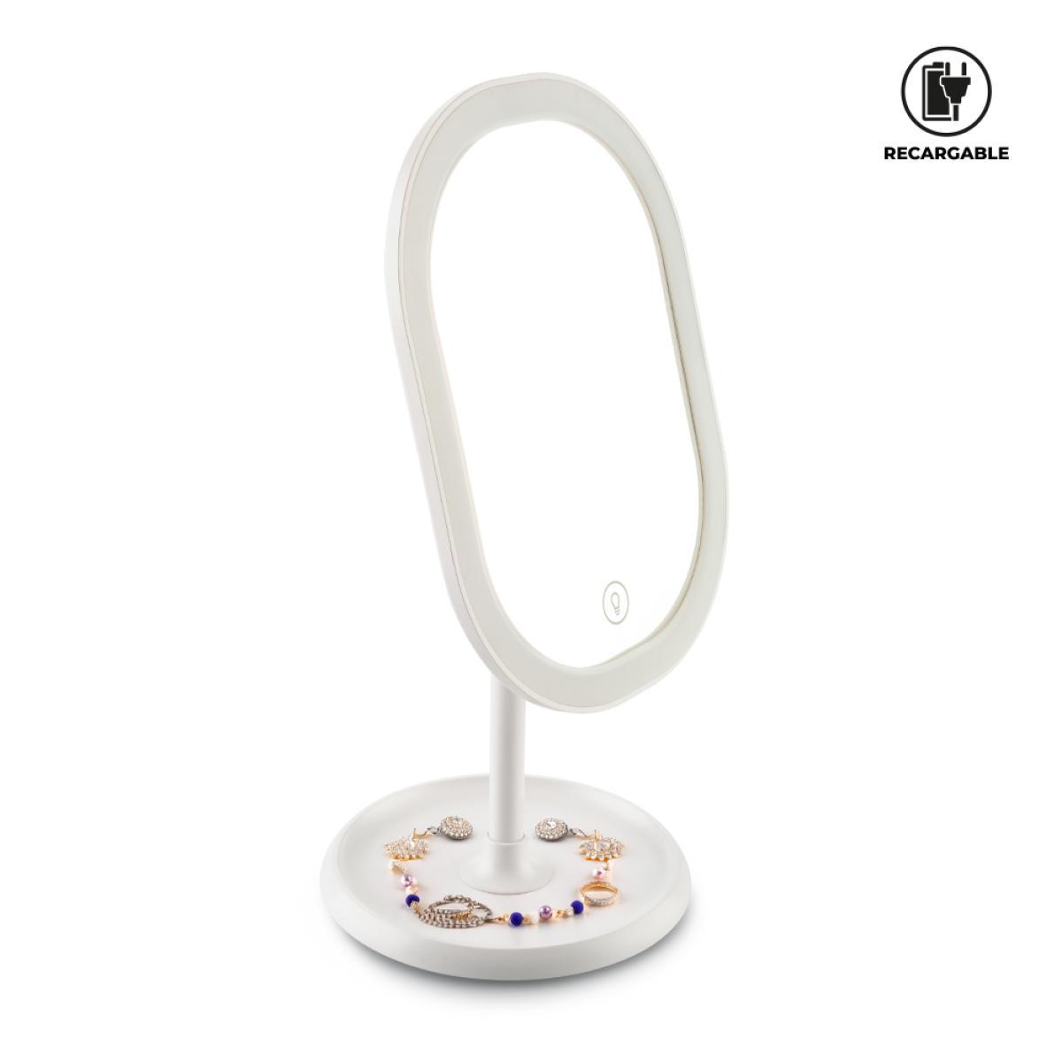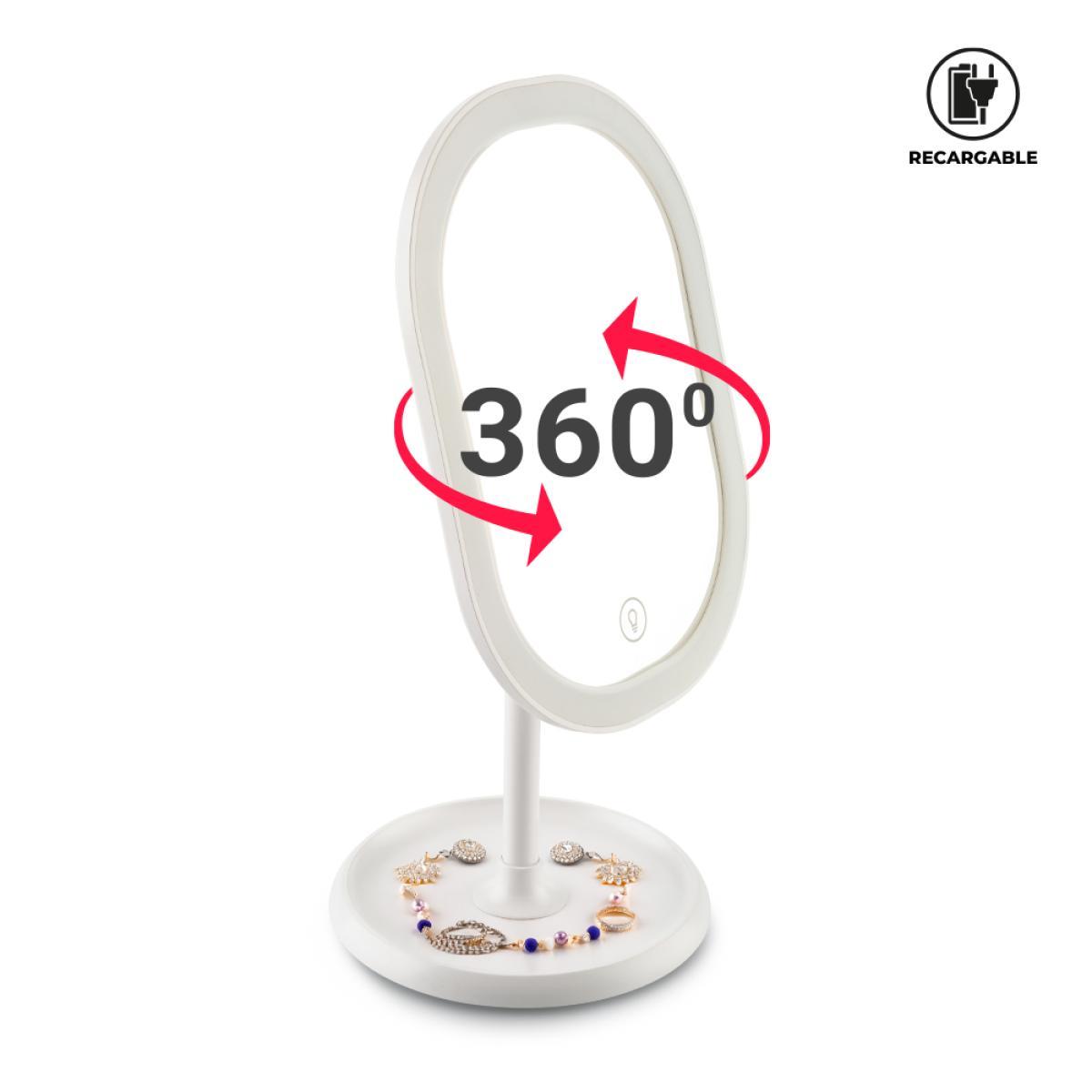 Espejo plástico con luz led y base. Con batería recargable de 1000mAh. Tres modos de luz. El espejo rota 180° hacia adelante y hacia atrás. Incluye cable Tipo C para carga. Empaque caja individual.