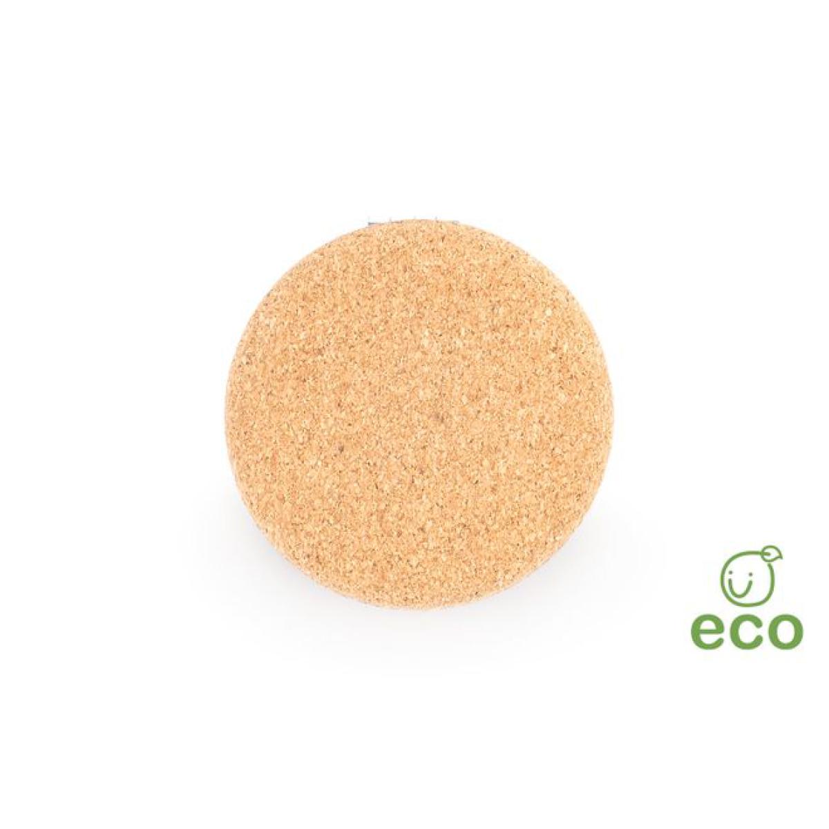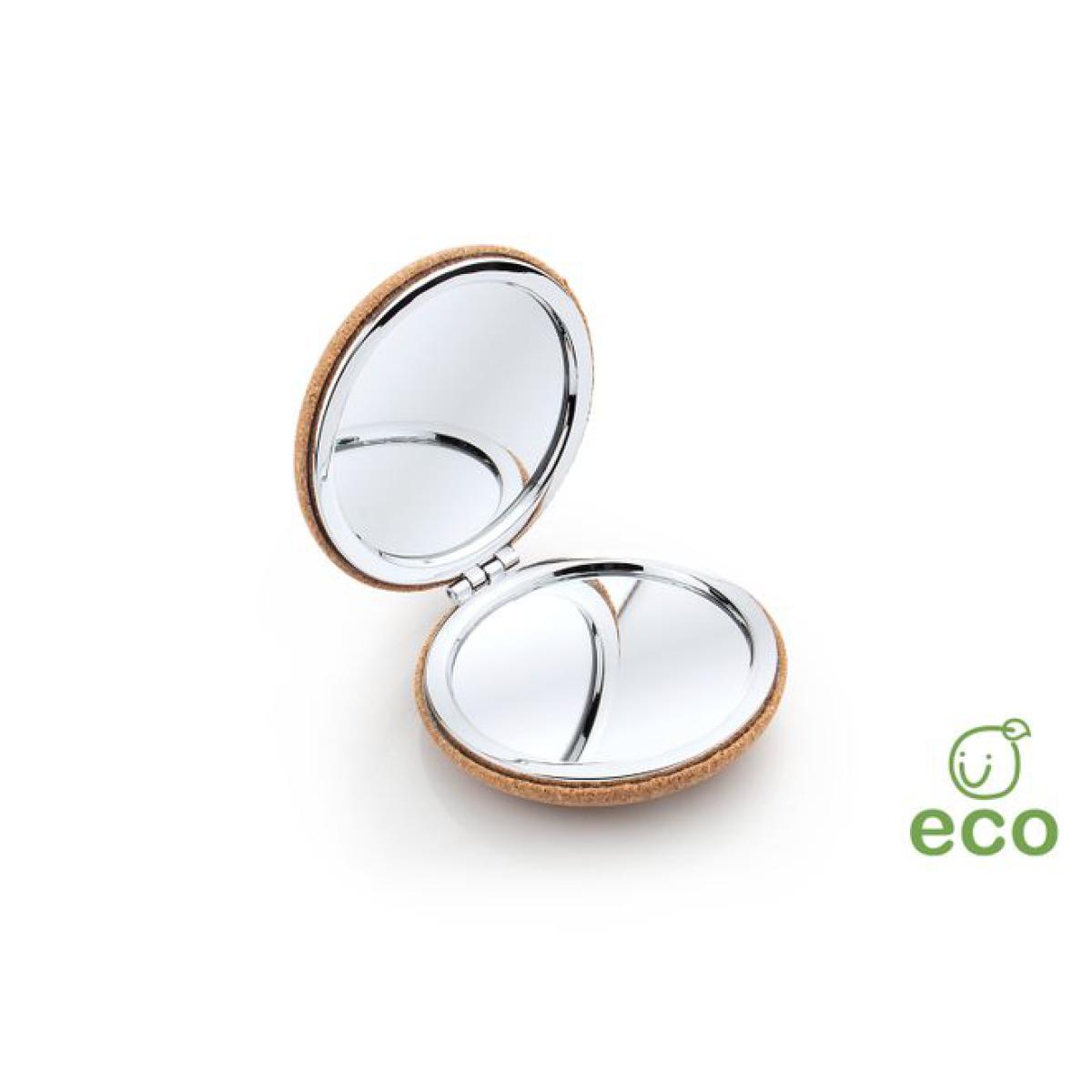 Espejo doble, vista normal y de aumento, cierre imantado. Diseño redondo en corcho.