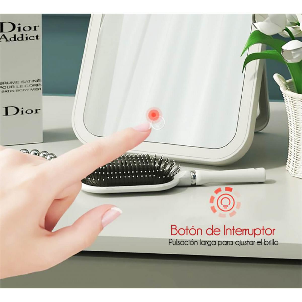 Espejo Recargable con luz Led tres modos de iluminación. Recarga con cable USB. Mantenga oprimido el botón con el dedo para aumentar o disminuir la intensidad de la luz. Pata trasera para ajustar el angulo de inclinación.