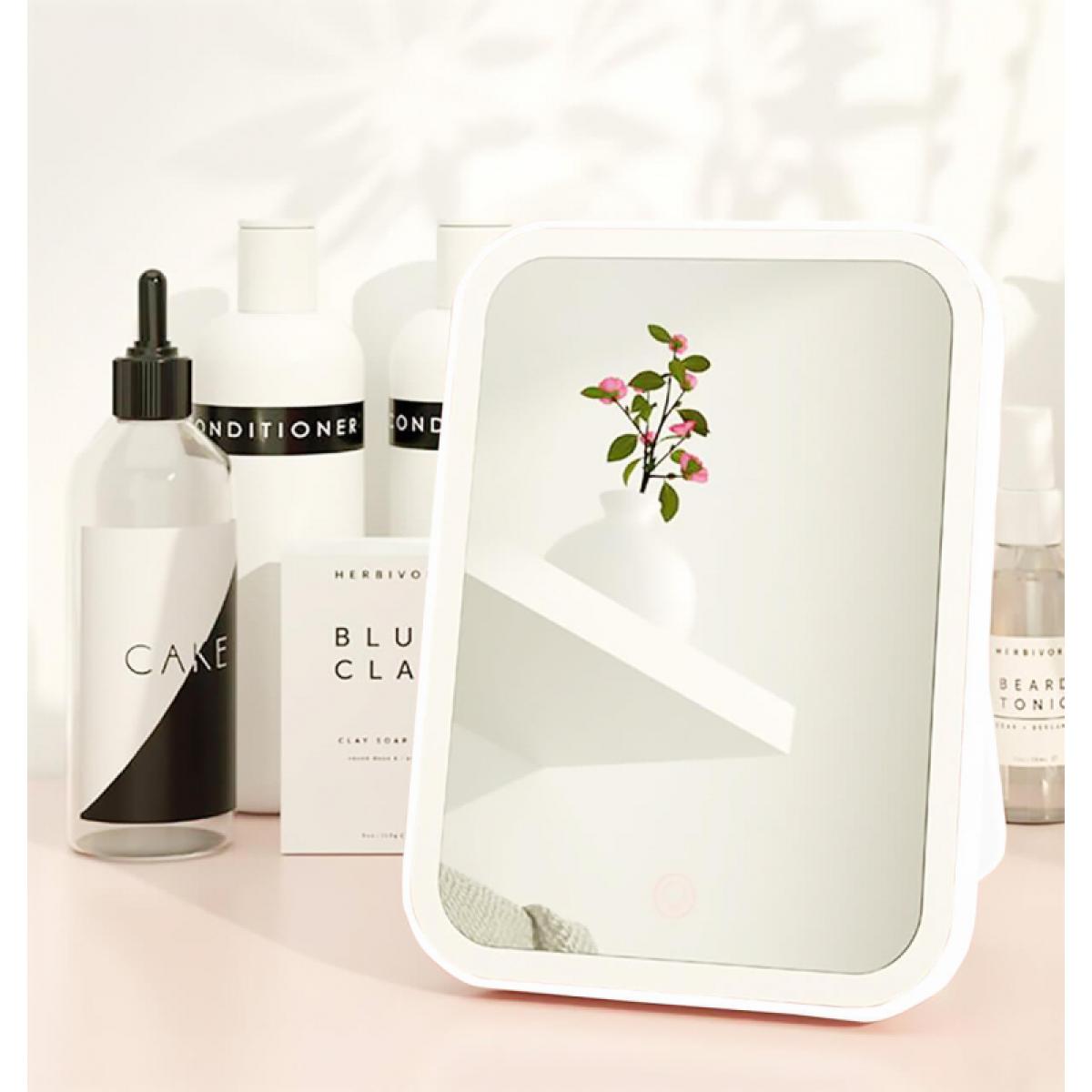 Espejo rectangular recargable con luz LED que ofrece tres modos de iluminación. Permite ajustar la intensidad de la luz manteniendo presionado el botón. Incluye pata trasera para ajustar el ángulo de inclinación. Ideal para maquillaje y cuidado facial.