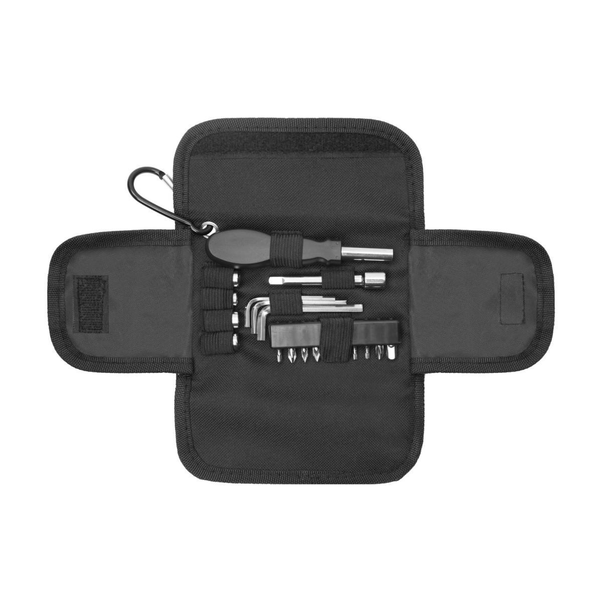 Herramientero Multi 19 Piezas con Estuche. 15 x 9,5 cm (cerrado) 15 x 23,5 cm (abierto). Acero y plastico. Set de herramientas de 19 piezas. Destornillador con 10 puntas diferentes, 3 llaves Allen, 4 llaves tubo de 4 medidas y alargue. Estuche con cierre de velcro y gancho. .