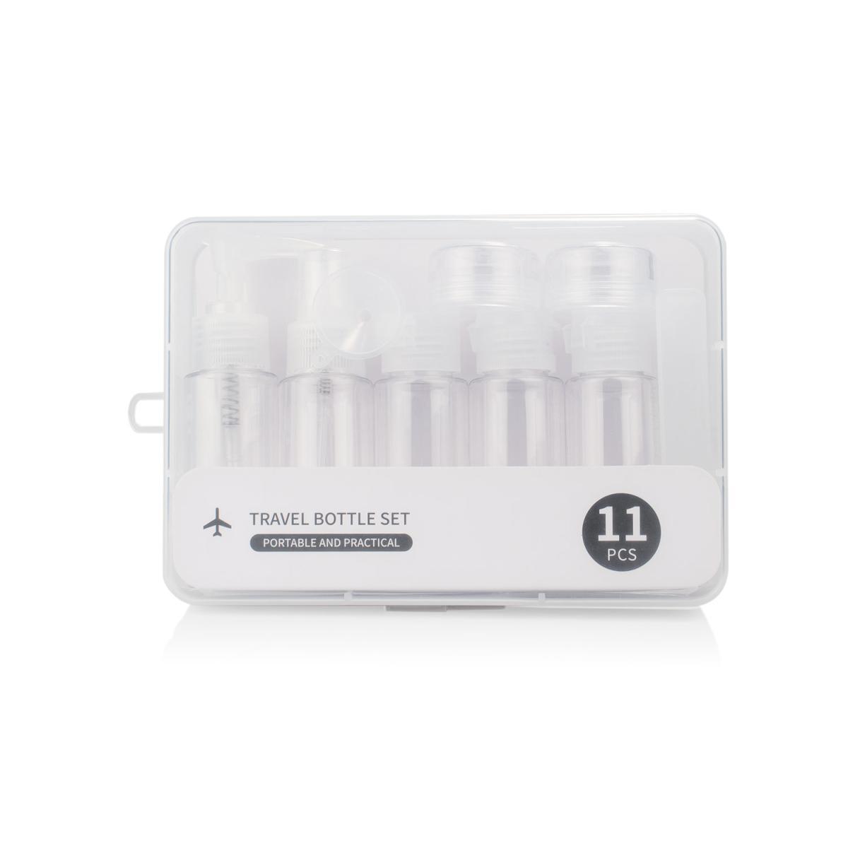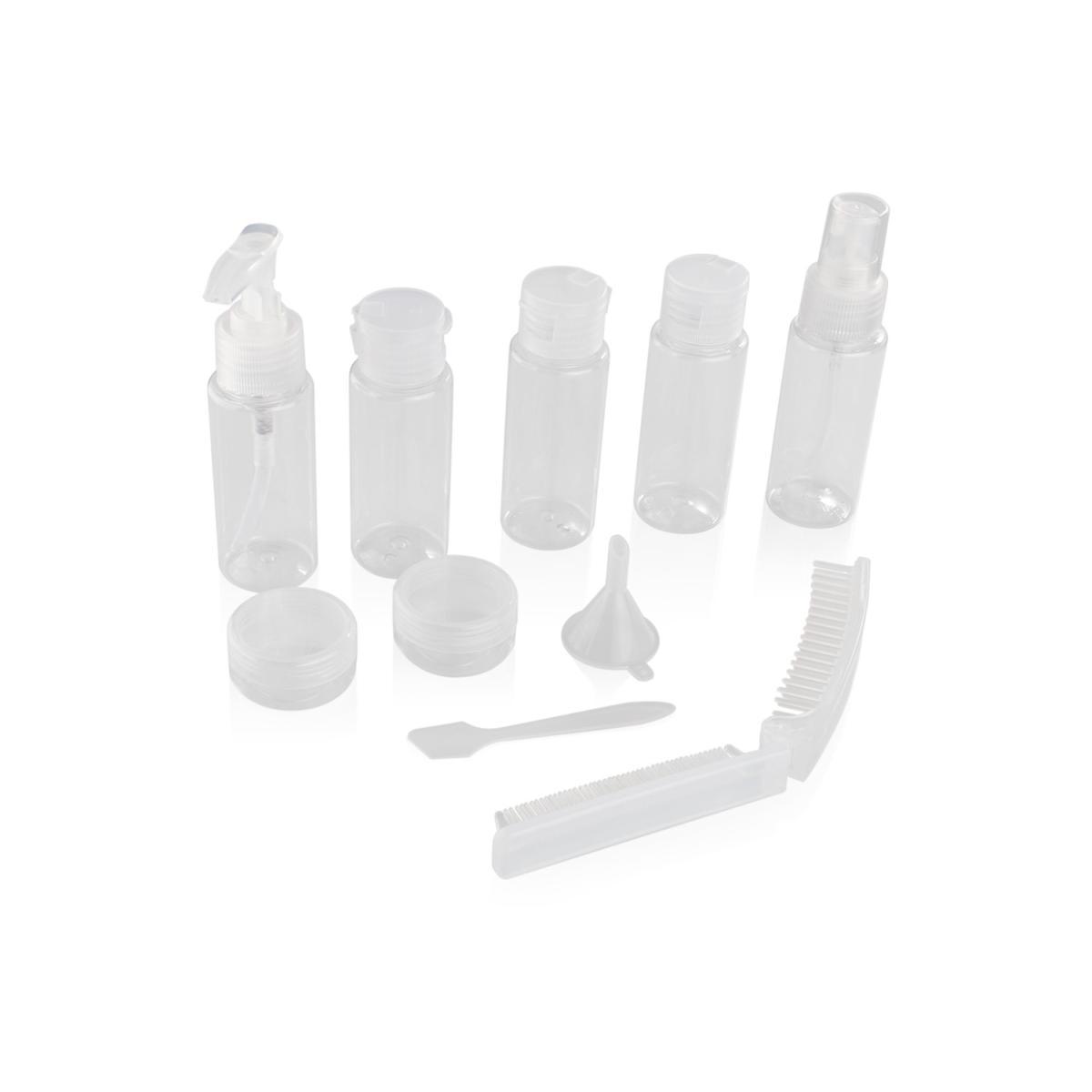 Set de botellas de plástico para viajes hechas en PET/PP. Ideales para transportar líquidos y cremas con facilidad, protegiendo la higiene de los productos.