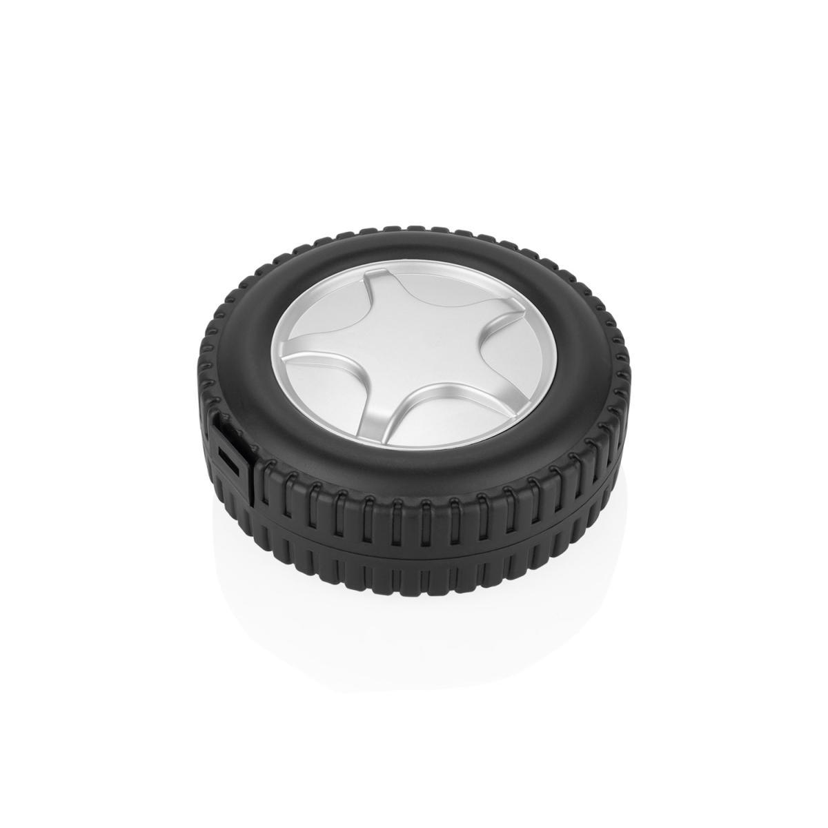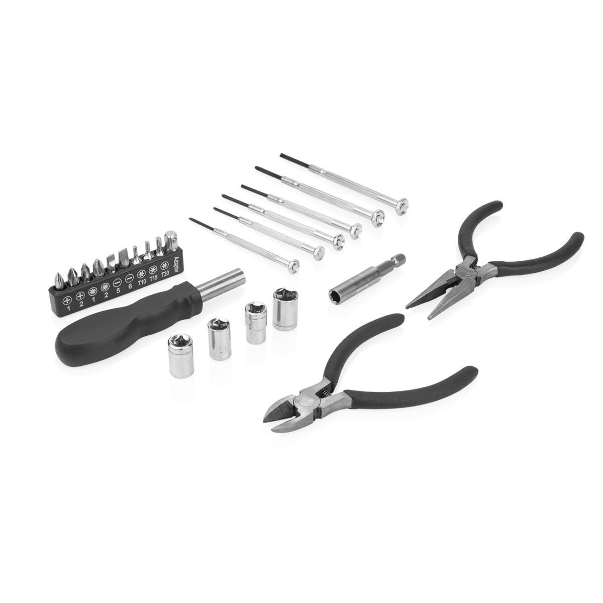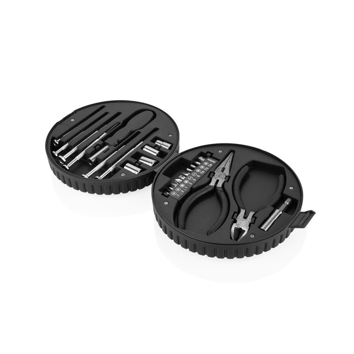 Kit de herramientas plástico en forma de llanta que contiene: 6 destornilladores de precisión, juego 10 de puntas, adaptador, extensor, 4 copas, alicate y cortafríos.