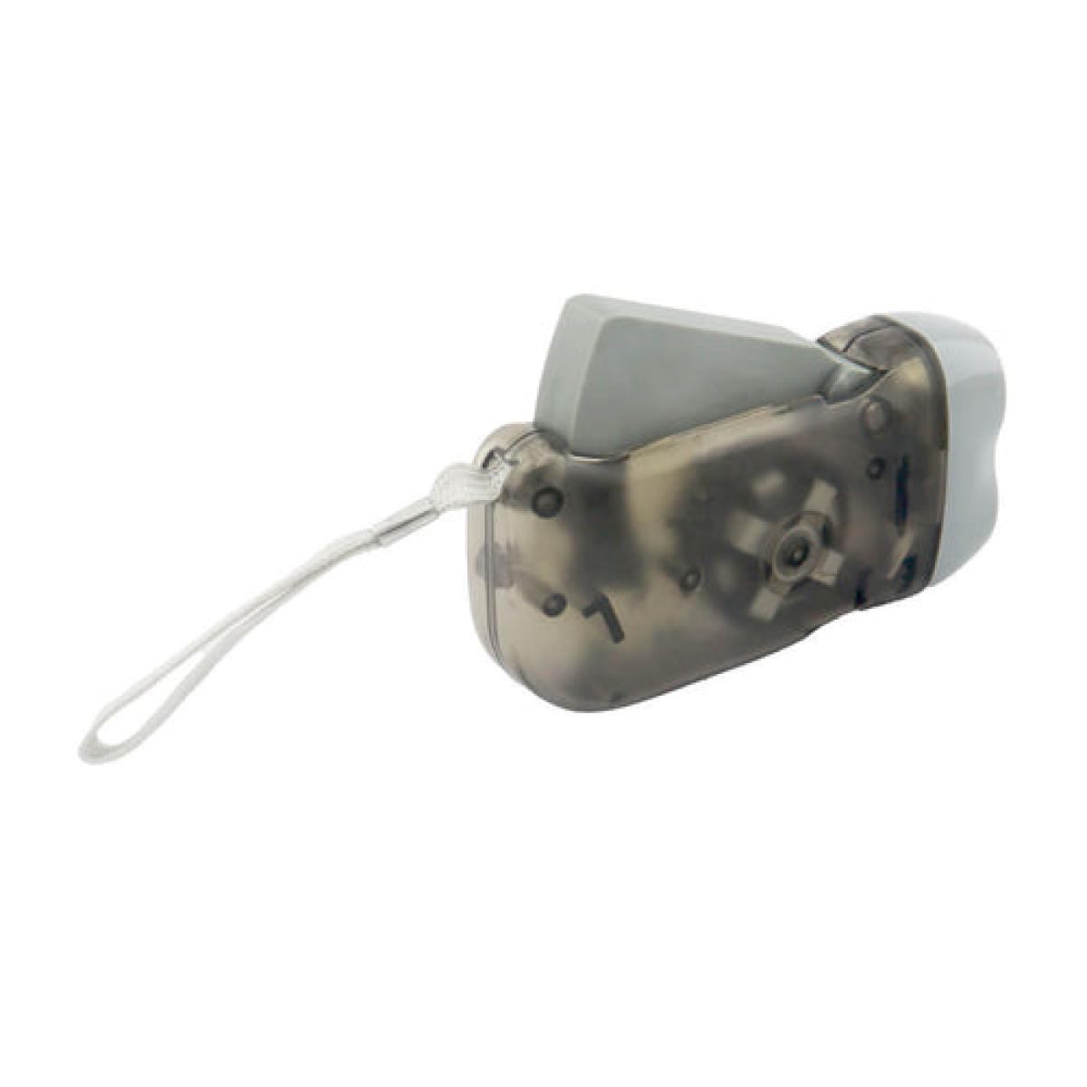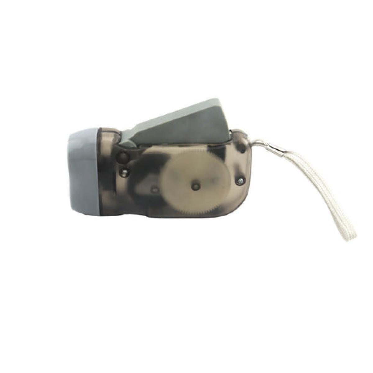 Linterna dinamo que no necesita baterías y cuenta con luces LED. Esta linterna de plástico de 10 cm de largo y 7 cm de ancho es ideal para iluminación sin depender de baterías. Incluye dos luces LED para mayor brillo y durabilidad.