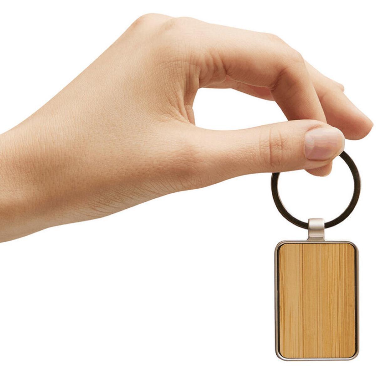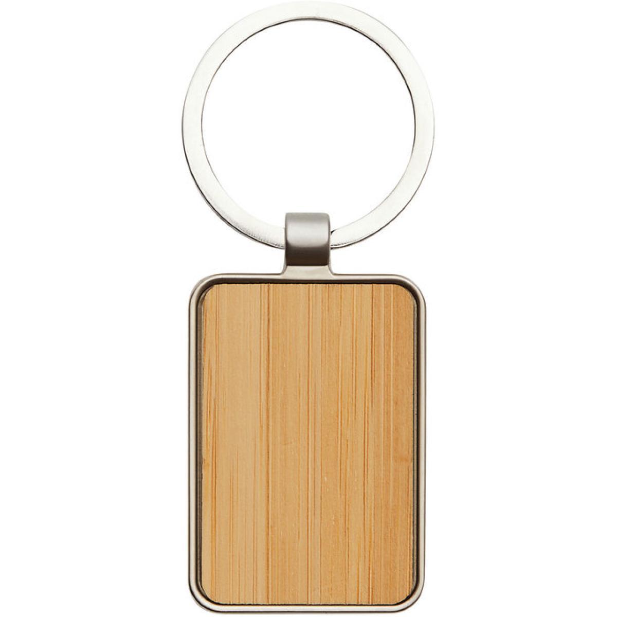 Sencillez y estilo en un diseño natural y funcionalLlavero con forma rectangular. Estructura metálica con aleación de zinc con acabado brillante y panel frontal de bambú barnizado. Medidas: 7,6 x 3,1 x 0,7 cm.