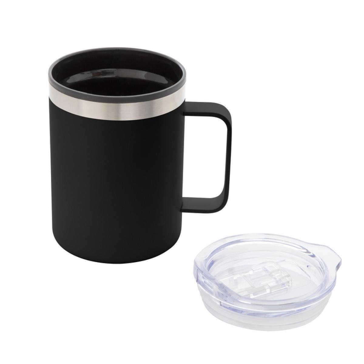 Mantén tus bebidas a la temperatura perfecta.Mug doble pared. Interior de polipropileno y exterior de acero 201. Tapa plástica transparente a presión con anillo de silicona. Pintura acabado semimate. Base negra antideslizante.Medidas: Diametro: 8,8 cm x 12,5 cm. Capacidad: 450 ml. Materiales: Acero inoxidable, plástico PP y PS. Presentación: en caja de regalo kraft.