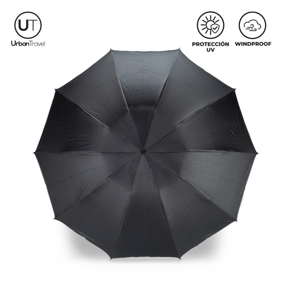 Paraguas plegable Urban Travel de 23 pulgadas con apertura y cierre automático. Fabricado en poliéster pongee 210T, incluye herraje metálico y fibra de vidrio para mayor resistencia. Cuenta con protección UV UPF40+, sistema antibrisa y mango con luz LED de dos modos. Además, tiene borde reflectivo para mayor seguridad y viene con forro para cargar.