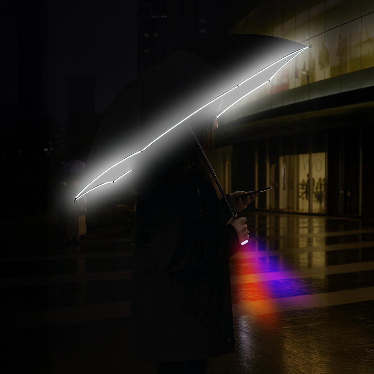 Paraguas plegable en poliéster pongee 210T. Apertura y cierre automático. Herraje metálico y fibra de vidrio. Sistema antibrisa y protección UV (UPF40+). Con forro para cargar. Mango plástico con luz LED de 2 modos diferentes. 10 cascos. Borde reflectivo.
