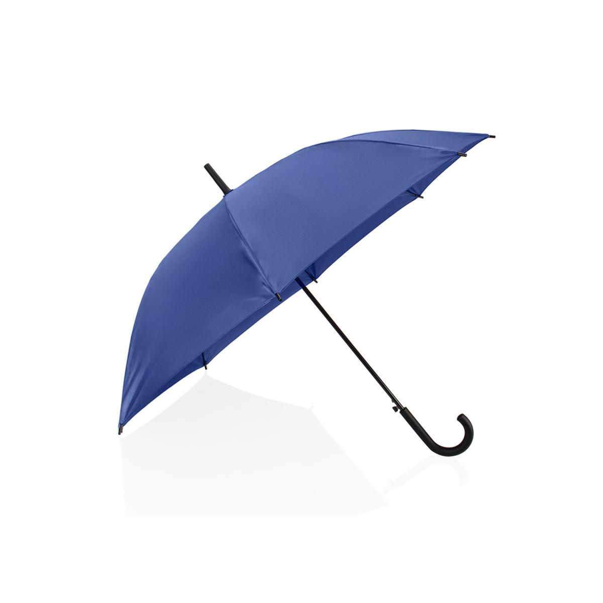 Paraguas tipo recto de 23" con apertura automática. Cuenta con estructura metálica con recubrimiento negro, eje central metálico y varillas largas de fibra de vidrio. Mango curvo en plástico PP con acabado tipo goma (soft touch), en el mismo color de la tela. Incluye puntas y remate superior plásticos.