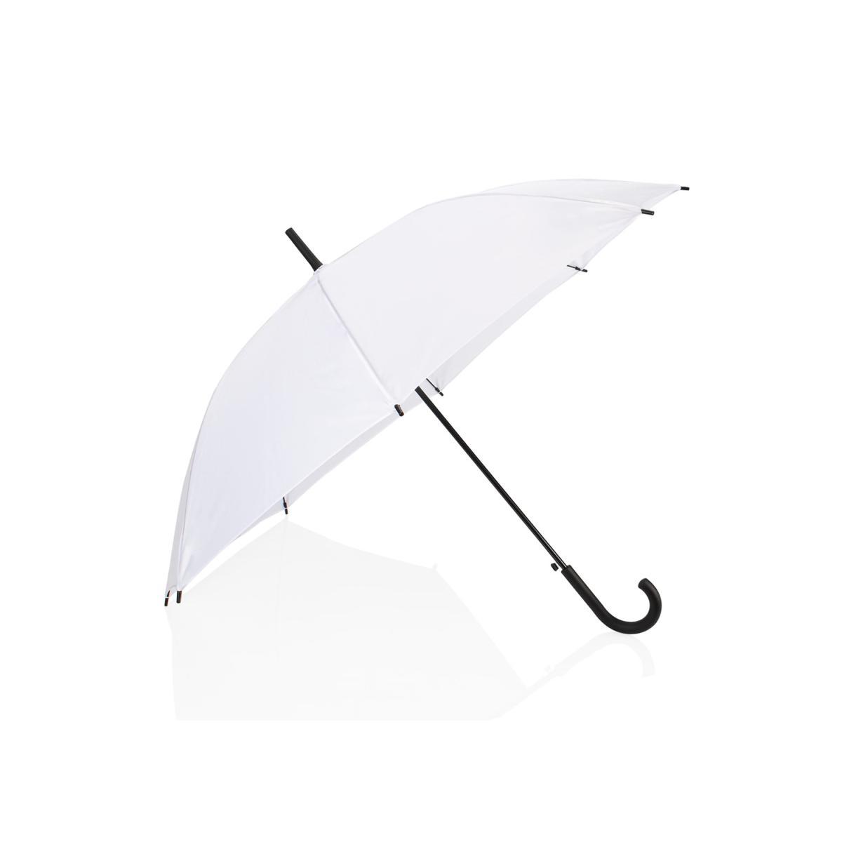 Paraguas recto de 23″ con apertura automática, estructura metálica negra y varillas de fibra de vidrio. Mango curvo Soft Touch en plástico PP, resistente y cómodo. Tela de poliéster 190T que ofrece excelente cobertura y durabilidad.