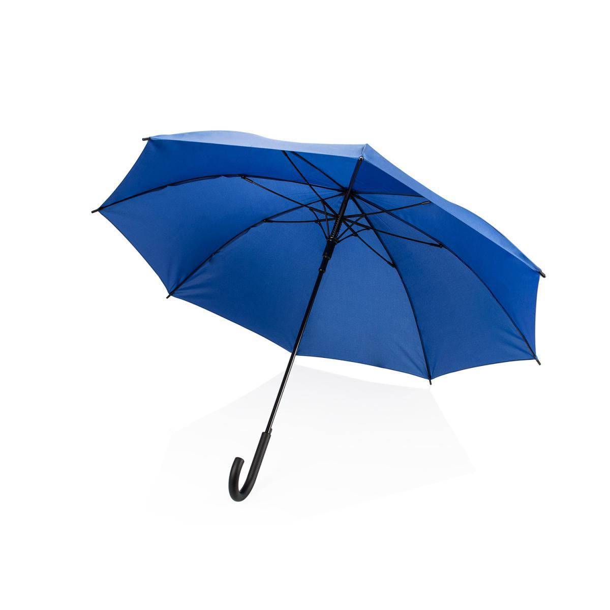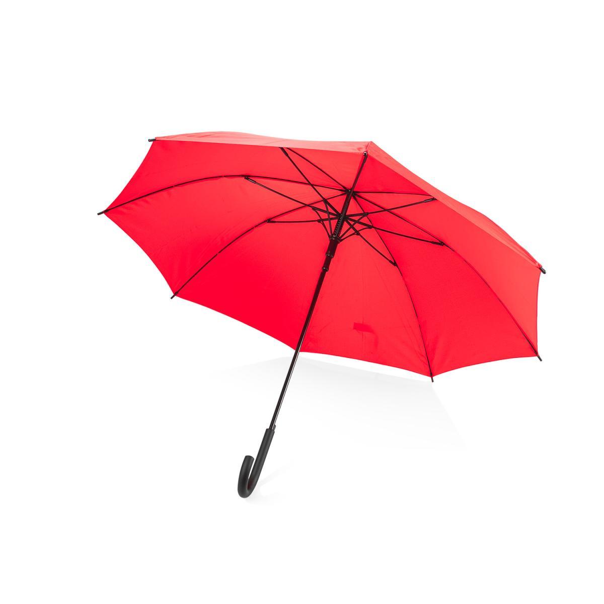 Paraguas tipo recto de 23" con apertura automática. Estructura completa de fibra de vidrio, con eje central de color negro y varillas resistentes. Cuenta con función corta-viento. Mango curvo de plástico PP con acabado tipo goma (soft touch), en el mismo color de la tela. Puntas y remate superior plásticos.