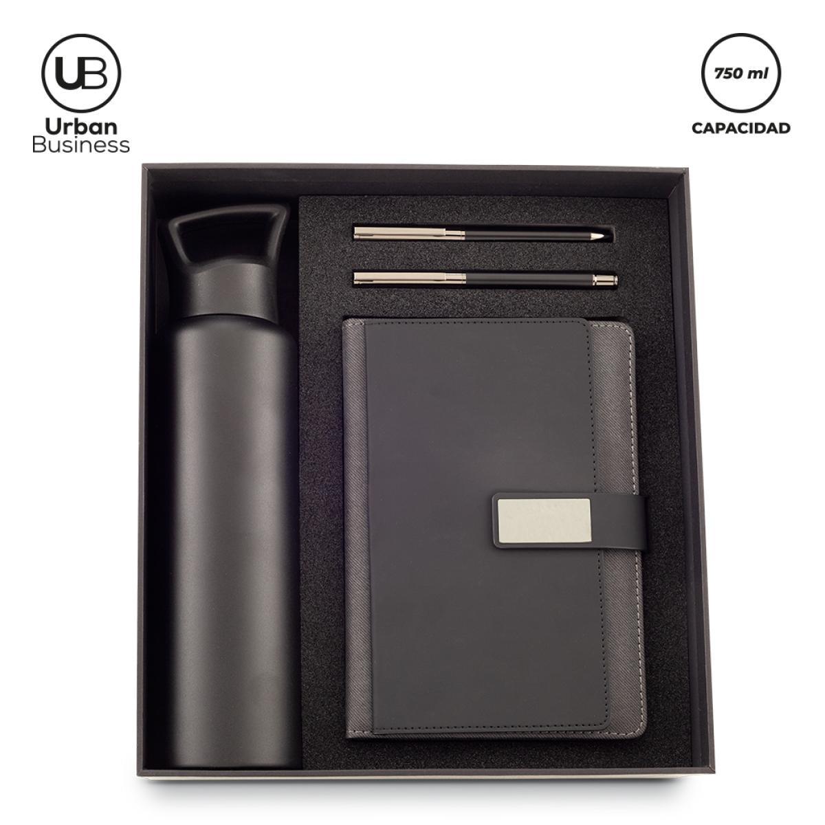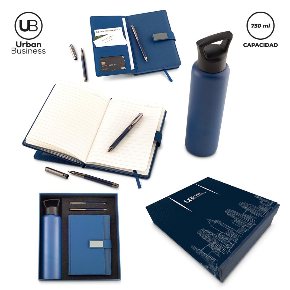 El Set Bantik Urban Business incluye una libreta de 21×14.5 cm con 96 hojas rayadas, cubierta en poliuretano y clip con imán. Además, cuenta con un botilito de acero inoxidable de 750 ml y dos bolígrafos metálicos, uno con mecanismo twist y otro tipo roller. Ideal para uso diario y profesional.