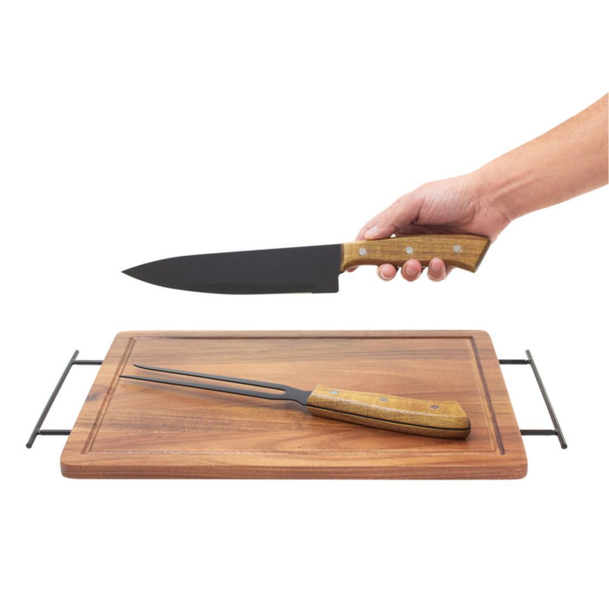 Set de asado. Tabla de corte / Bandeja de madera de acacia con asa de ambos lados de acero de carbono. Contiene 2 utensilios de acero inoxidable 420 y mangos de madera de acacia: Cuchillo de 33,5 cm y 150 g, y Tenedor de 31,5 cm y 115 g. Cada utensilio y el set completo se presentan en caja de regalo kraft.