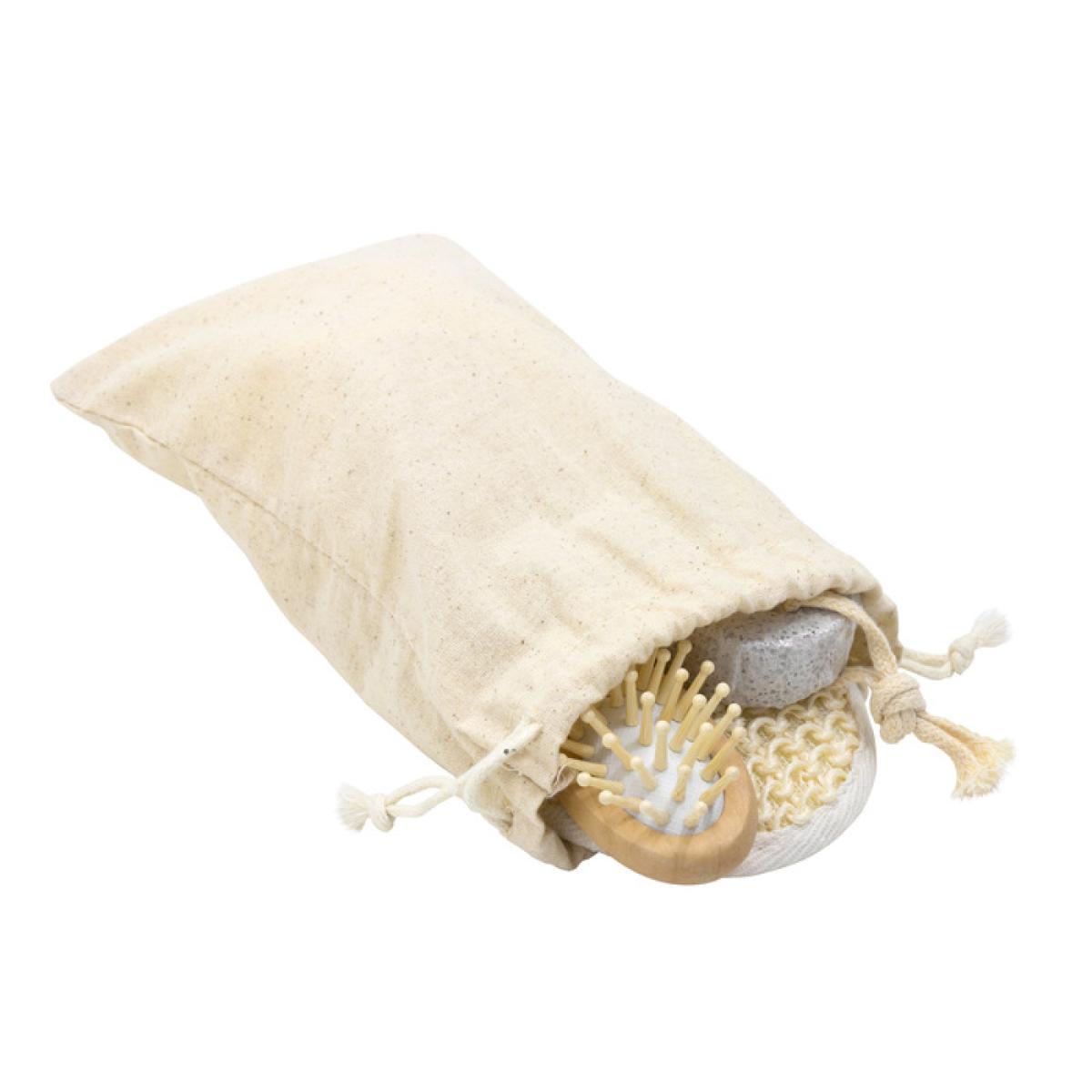 Lujo en tu rutina.Set de baño / Spa. Incluye: 5 accesorios de belleza y limpieza. Espejo de bambú (Diametro: 7,2 x 0,8 cm.); Cepillo de madera (12,5 x 3,7 x 3,5 cm.); Piedra pómez con cordón de algodón (9,5 x 4,5 x 2cm.); Esponja bola de red con cordón de poliéster (Diametro: 9 cm.); Esponja de mano con elástico, recubierta en algodón y tejido exfoliante (14,7 x 9,7cm.). Medidas: 14,5 x 20 cm. Materiales: Algodón, Bambú, TPE, Madera y PE. Presentación: El set se entrega en bolsa contenedora con cordón de algodón y bolsa de polietileno para su protección.
