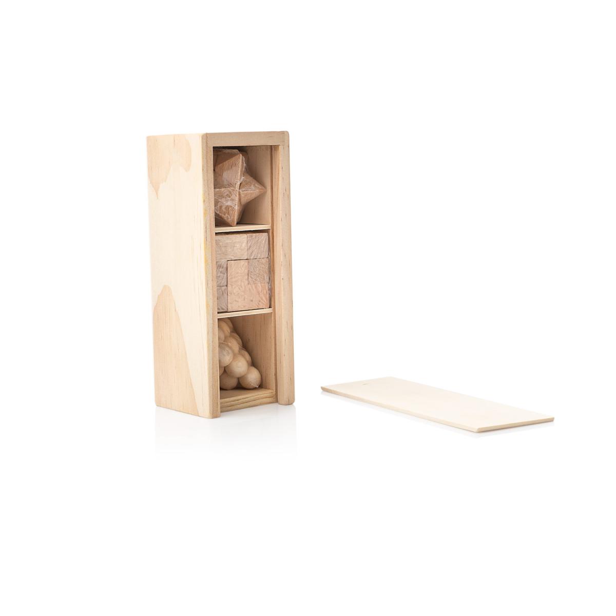 Set en madera con 3 juegos de lógica, rompecabezas 3D para pensar como armar, en practica caja de almacenamiento y tapa deslizante.