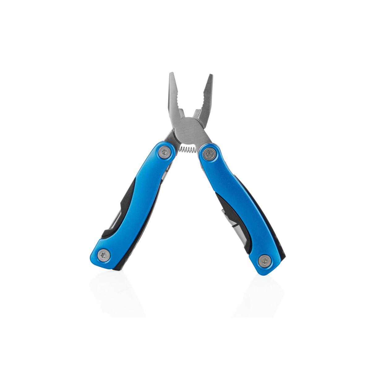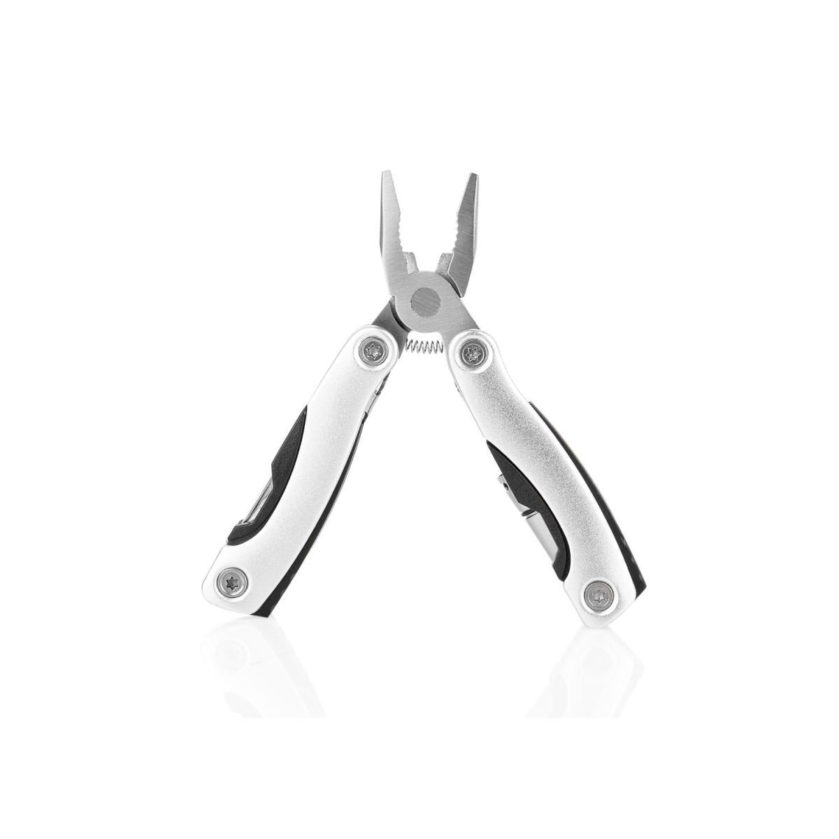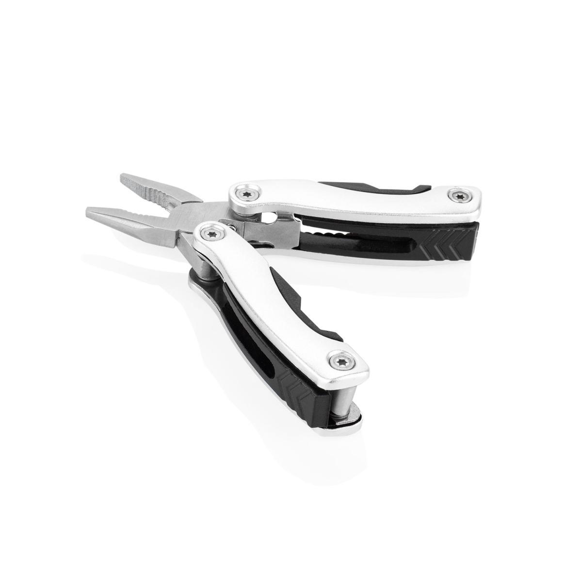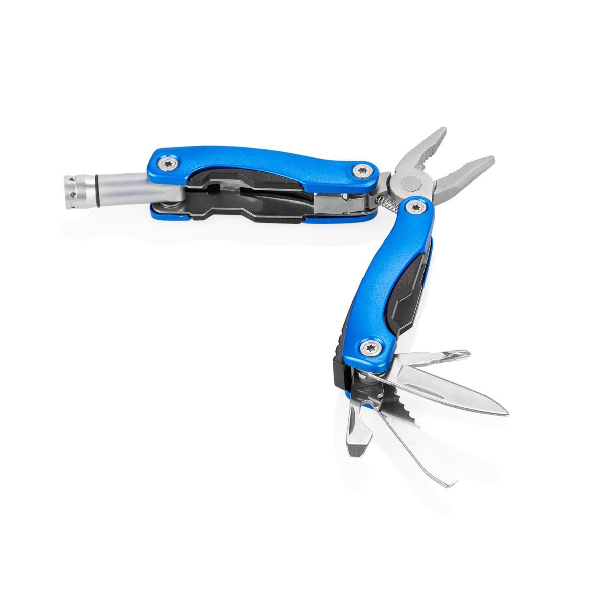 Herramientero metálico con estuche. Incluye alicate, linterna con luz LED, destornillador de estrella, pala, navaja y sierra. Estuche con cierre en velcro.