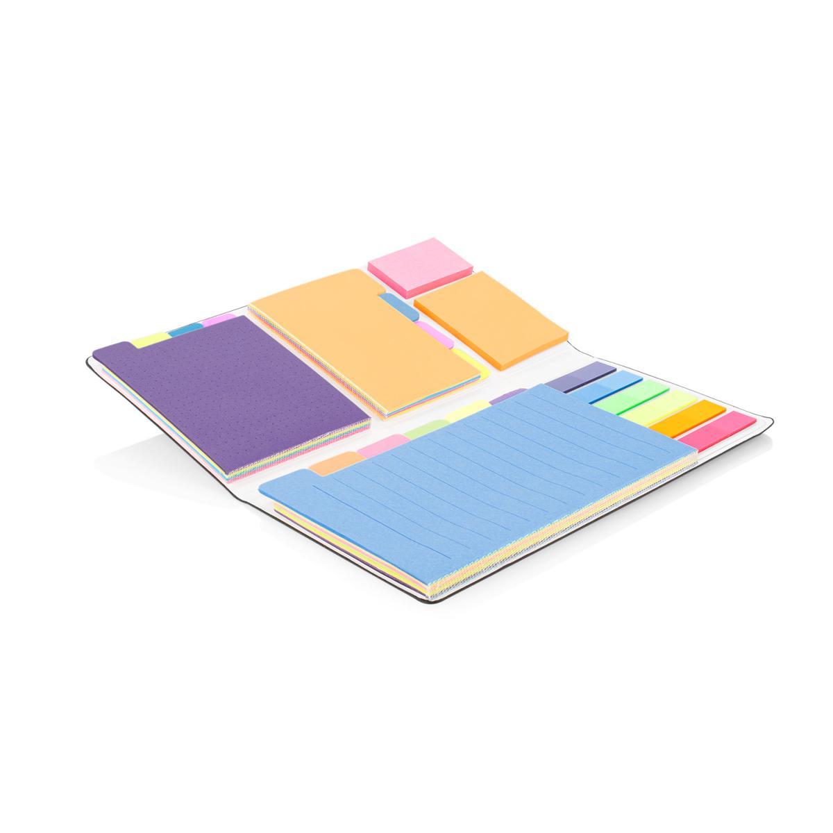 Set de memos en 5 tamaños disponibles. Los memos con rayas vienen en 6 colores; azul, naranja, rosa neón, verde, amarillo y morado. Los memos con puntos vienen en 4 colores: morado, amarillo, azul y rosa neón. Los memos sin estampados vienen en 4 colores: naranja, azul. rosa y amarillo, y los memos más pequeños, en color naranja y rosa. Los stickers separadores vienen en 6 colores.