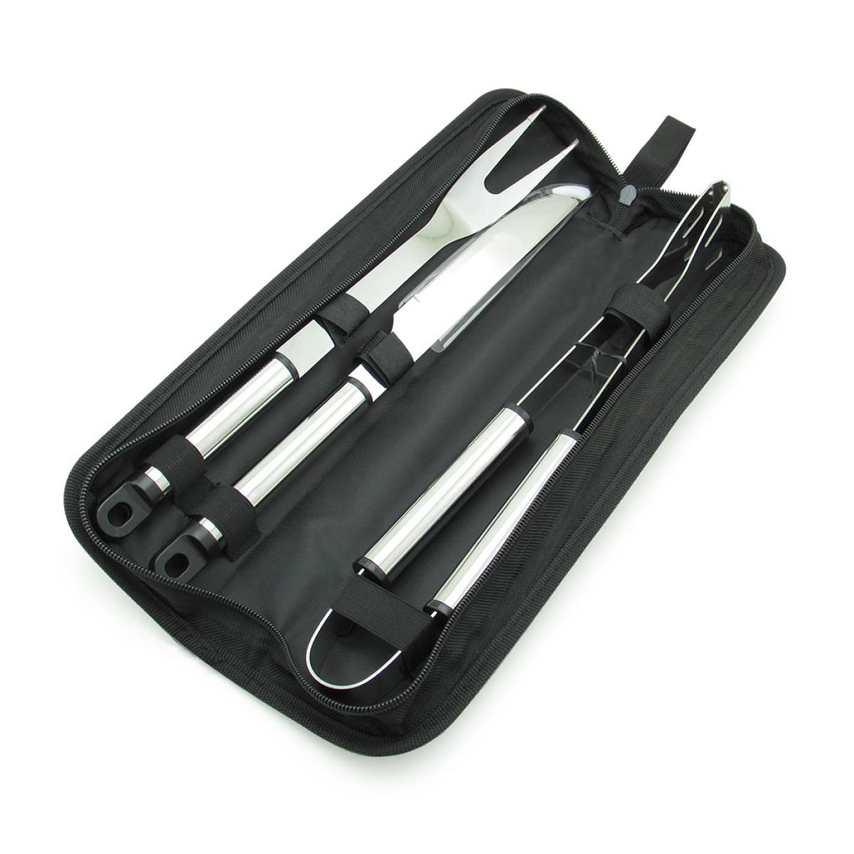 Set Para Asados bbq Tres Accesorios Incluye Estuche. En tela y carton con tres utensilios: Cuchillo, pinzas y tenedor