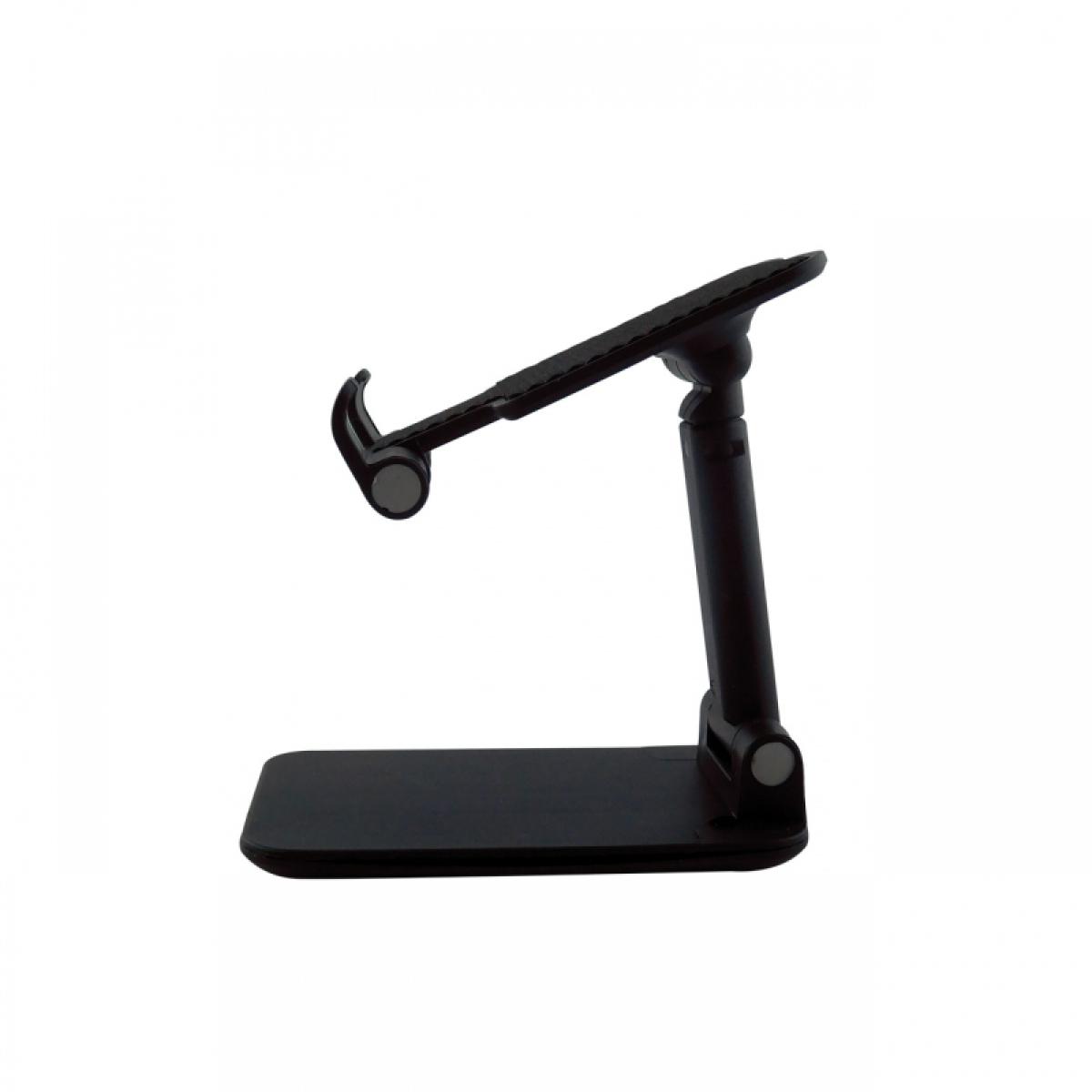Soporte plegable de plástico para celular y tablet con altura ajustable a dos niveles y ángulo variable. Incluye goma antideslizante para mayor estabilidad.