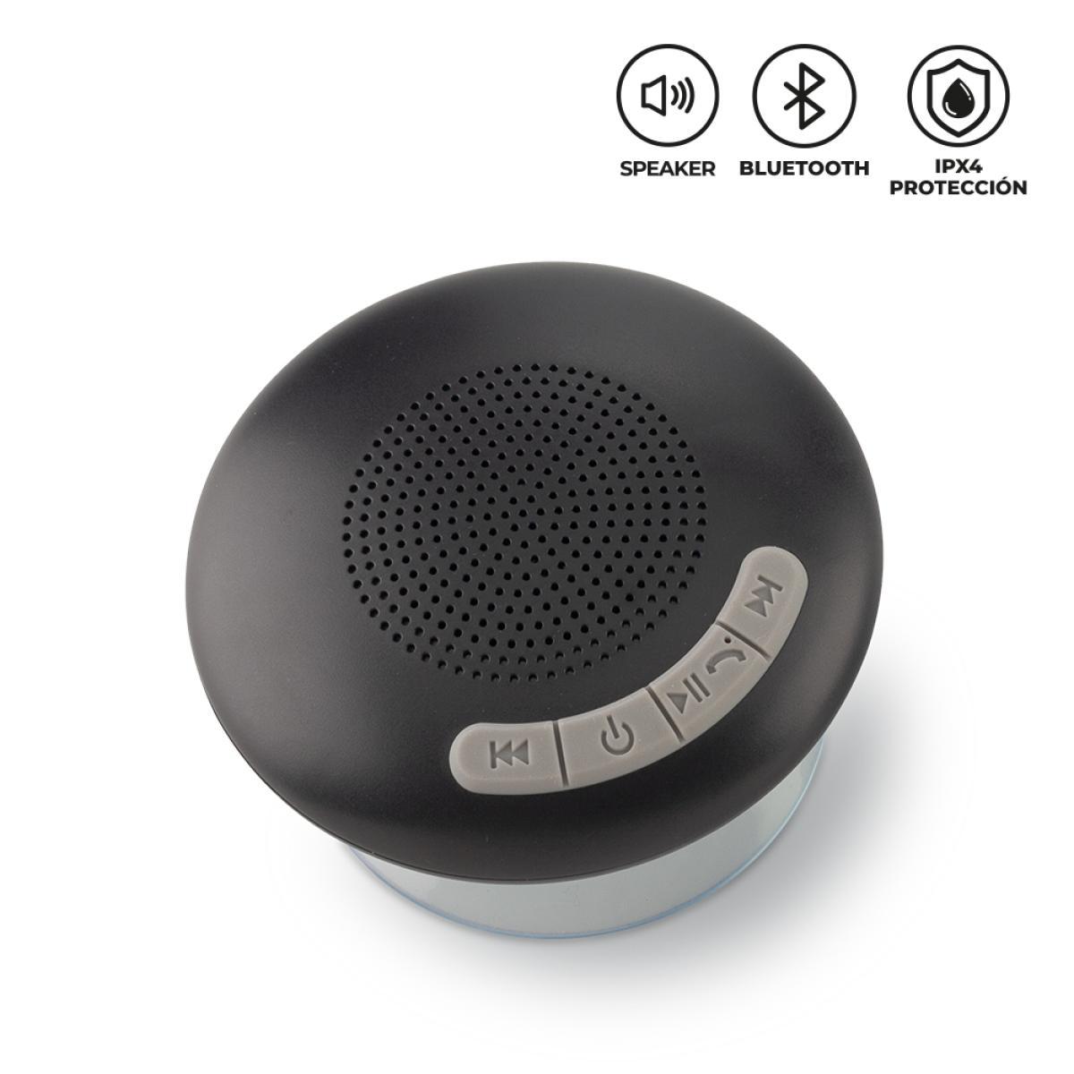 Speaker Bluetooth plástico con chupa. Resistente al agua. Potencia: 3W. Capacidad de la batería: 300 mAh. Tiempo de funcionamiento: 2 horas aprox. Rango de conexión: 10 mt.