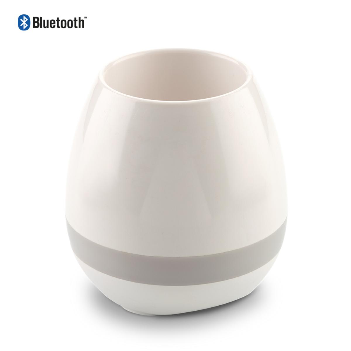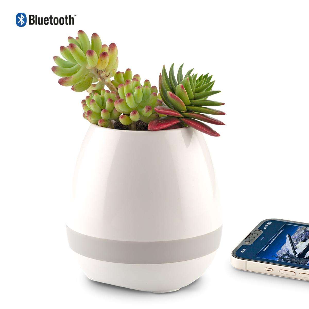 Speaker plástico Bluetooth de 3W con luz LED multicolor y matera para plantas. Funciona como manos libres. Empaque caja individual.